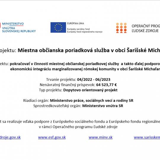 Miestna občianska poriadková služba v obci Šarišské Michaľany je dôležitým projektom, ktorý sa zameriava na podporu ekonomickej integrácie marginalizovanej rómskej komunity. Tento projekt, trvajúci od apríla 2022 do júna 2023, je realizovaný s finančnou podporou vo výške 64 523,77 € z Európskeho sociálneho fondu a Európskeho fondu regionálneho rozvoja. Riadiacim orgánom je Ministerstvo práce, sociálnych vecí a rodiny SR a sprostredkovateľom Ministerstvo vnútra SR. Cieľom projektu je posilniť činnosť občianskej poriadkovej služby a prispieť k lepšej integrácii komunity.